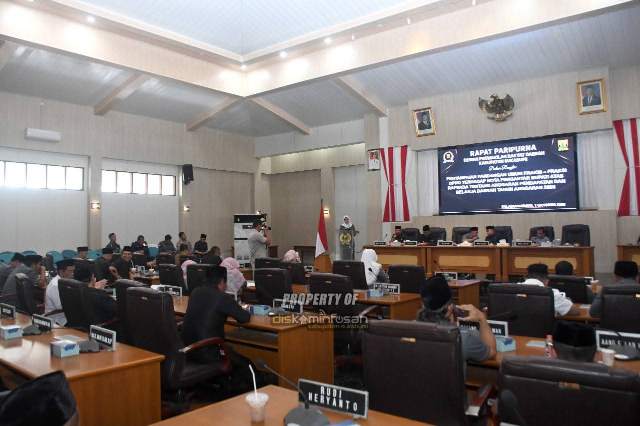 Bupati Sukabumi H Asep Japar bersama Wakil Bupati H Andreas menghadiri Rapat Paripurna DPRD Kabupaten Sukabumi dengan agenda penyampaian pandangan umum fraksi-fraksi terhadap nota pengantar Bupati atas Rancangan Peraturan Daerah (Raperda) tentang Anggaran Pendapatan dan Belanja Daerah (APBD) Tahun Anggaran 2026.