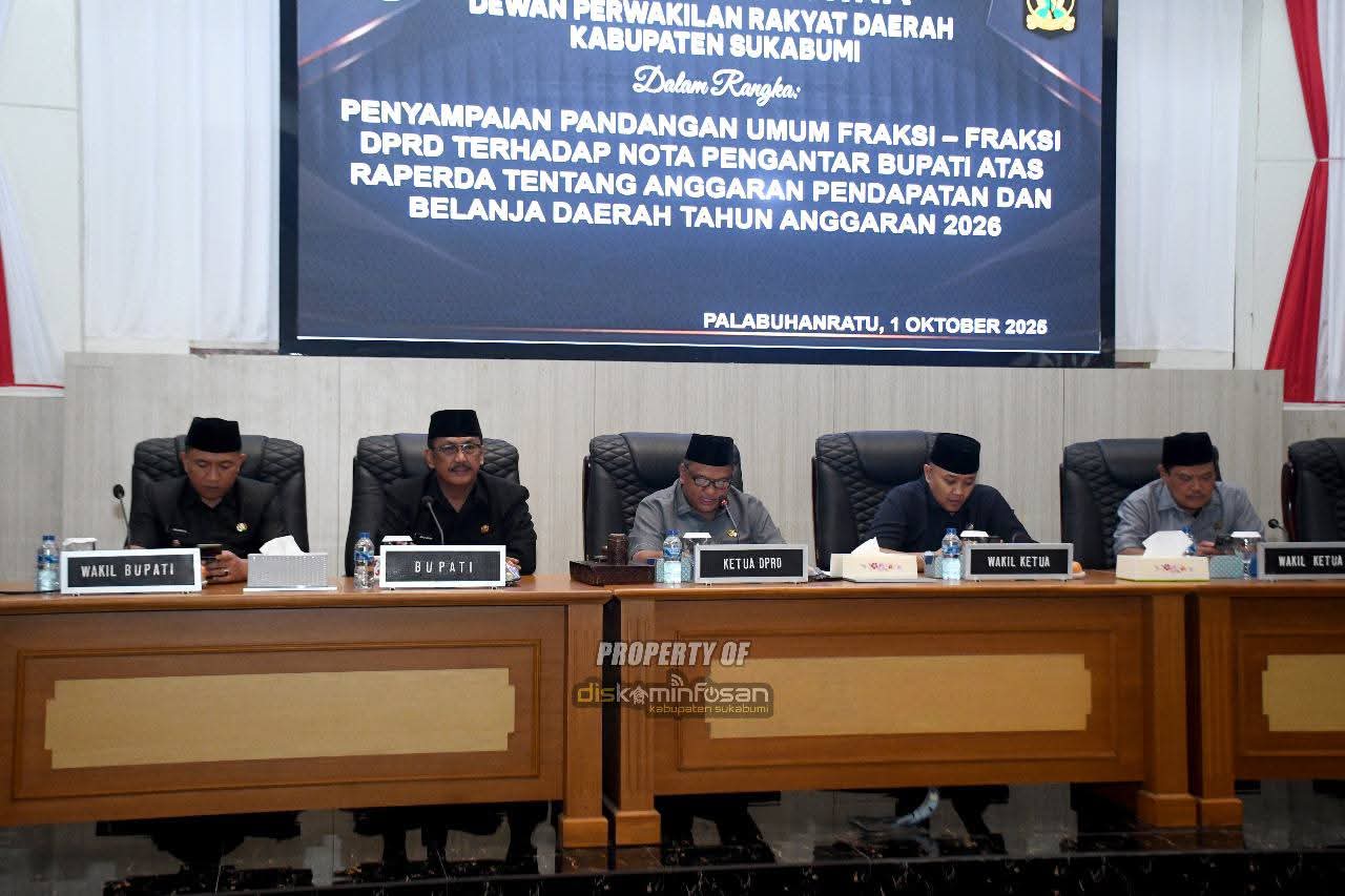 Bupati Sukabumi H Asep Japar bersama Wakil Bupati H Andreas menghadiri Rapat Paripurna DPRD Kabupaten Sukabumi dengan agenda penyampaian pandangan umum fraksi-fraksi terhadap nota pengantar Bupati atas Rancangan Peraturan Daerah (Raperda) tentang Anggaran Pendapatan dan Belanja Daerah (APBD) Tahun Anggaran 2026.