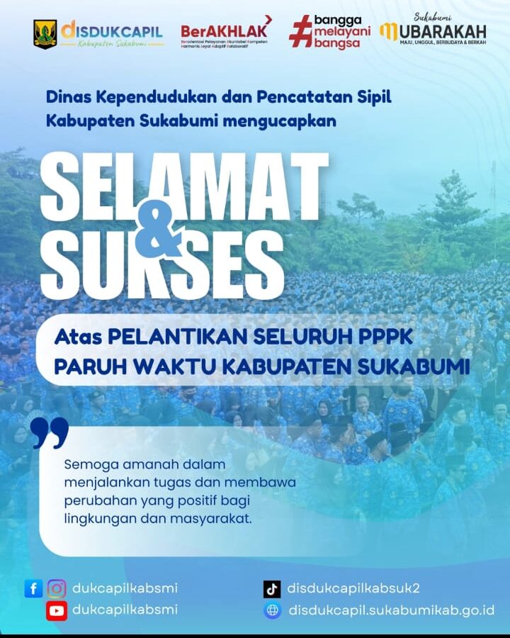 DISDUKCAPIL Kabupaten Sukabumi Mengucapkan Selamat dan Sukses Atas Pelantikan Seluruh PPPK Paruh Waktu Kabupaten Sukabumiadmin10/12/2025Sukabumi35881 Views Post Views: 35,881 Don't MissDua Desa Di Cicantayan Jadi Unggulan Gelari Pelangi, Bupati Optimis Raih PrestasiPERUMDA Air Minum Tirta Jaya Mandiri Kabupaten Sukabumi Resmi Membuka Program Pasang Baru Sambungan Langganan (SL) MandiriPerumda Air Minum Tirta Jaya Mandiri Kabupaten Sukabumi Ucapkan Selamat atas Terpilihnya Drs. Teddy Setiabudi, M.T. sebagai Ketua Umum PERPAMSI 2025–2029Pesona Wisata Sukabumi, Perpaduan Alam, Budaya, dan Petualangan dalam Satu DaerahBanjir Bandang Di Aceh Tamiang Seperti Tsunami Ke 2Oleh-Oleh Khas Sukabumi, Cita Rasa Lokal yang Selalu Dirindukan Wisatawan