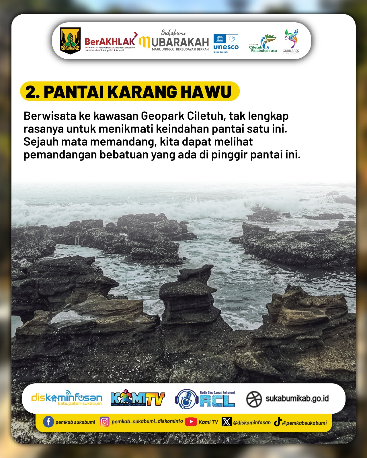 Dengan segala pesonanya, Karang Hawu menjadi bukti bahwa Kabupaten Sukabumi menyimpan potensi wisata alam yang luar biasa. Pemerintah daerah mengajak masyarakat dan wisatawan untuk menjaga kebersihan serta kelestarian lingkungan agar keindahan Karang Hawu terus dapat dinikmati oleh generasi mendatang.