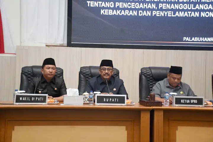 Bupati Sukabumi H Asep Japar bersama Wakil Bupati H Andreas menghadiri rapat paripurna DPRD Kabupaten Sukabumi dengan agenda penyampaian pandangan umum fraksi-fraksi terhadap Nota Pengantar Bupati mengenai Rancangan Peraturan Daerah (Raperda) tentang Pencegahan, Penanggulangan, Penyelamatan Kebakaran, dan Penyelamatan Non Kebakaran.