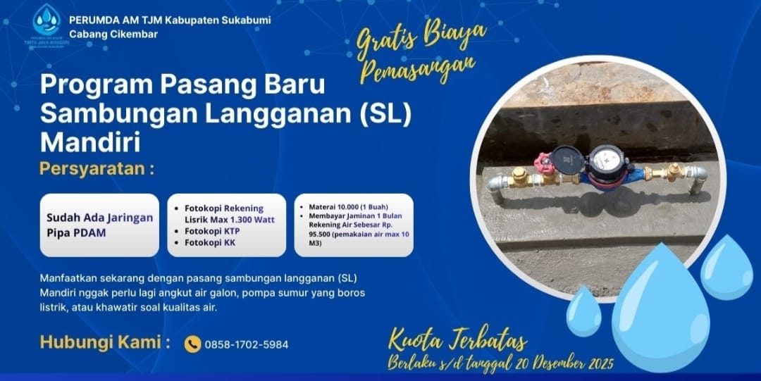 Dengan persyaratan yang mudah dan proses yang cepat, masyarakat kini dapat menikmati akses air bersih langsung ke rumah tanpa hambatan. Program ini sekaligus menjadi bentuk komitmen Perumda AM TJM dalam meningkatkan pelayanan serta mendukung pemerataan akses air minum di seluruh wilayah Kabupaten Sukabumi.
