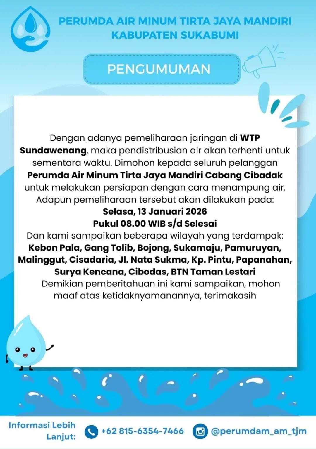 suarapalabuhanratu.com – Sukabumi, Perumda Air Minum Tirta Jaya Mandiri Kabupaten Sukabumi mengumumkan akan melaksanakan kegiatan pemeliharaan jaringan di WTP Sundawenang pada Selasa, 13 Januari 2026, mulai pukul 08.00 WIB hingga selesai.